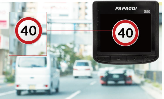 カメラで撮影した『速度制限標識』をリアルタイムで画像識別し、表示と音でお知らせ。初めて走る道路や、いつも慣れている道路にある『速度制限標識』をドライバーに気づかせてくれます。最近では『ゾーン30』という生活道路の歩行者や自転車の安全な通行を確保する区域で時速30キロの速度規制などの発見にも役立ちます。