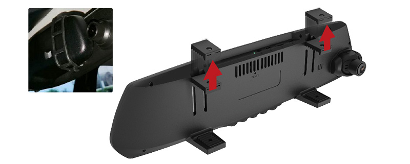 ②本体をルームミラーに挟みこみ:ルームミラーを手でおさえて取り付けください。 取付アームを伸ばして固定範囲を広げる