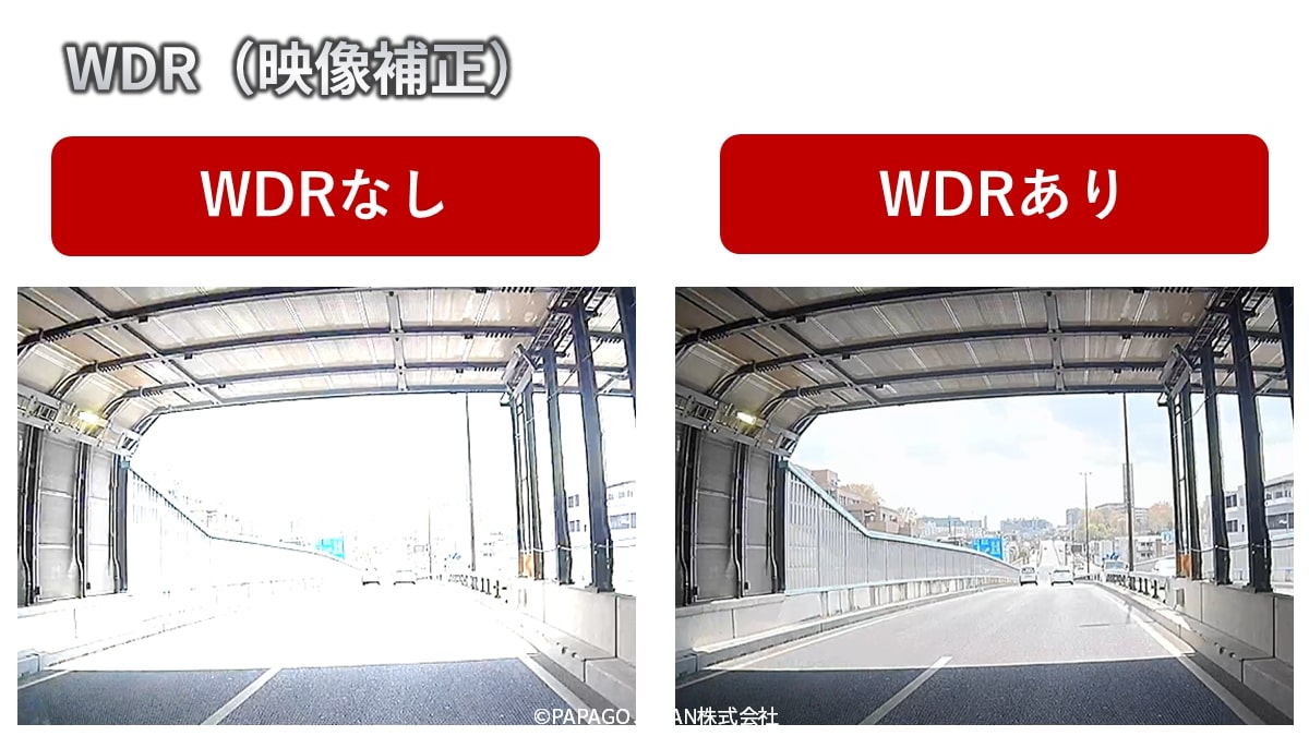トンネルや駐車場の出入口で発生しやすい明るさの変化があるとき、白とび、黒つぶれ対策として、映像を補正する機能です。